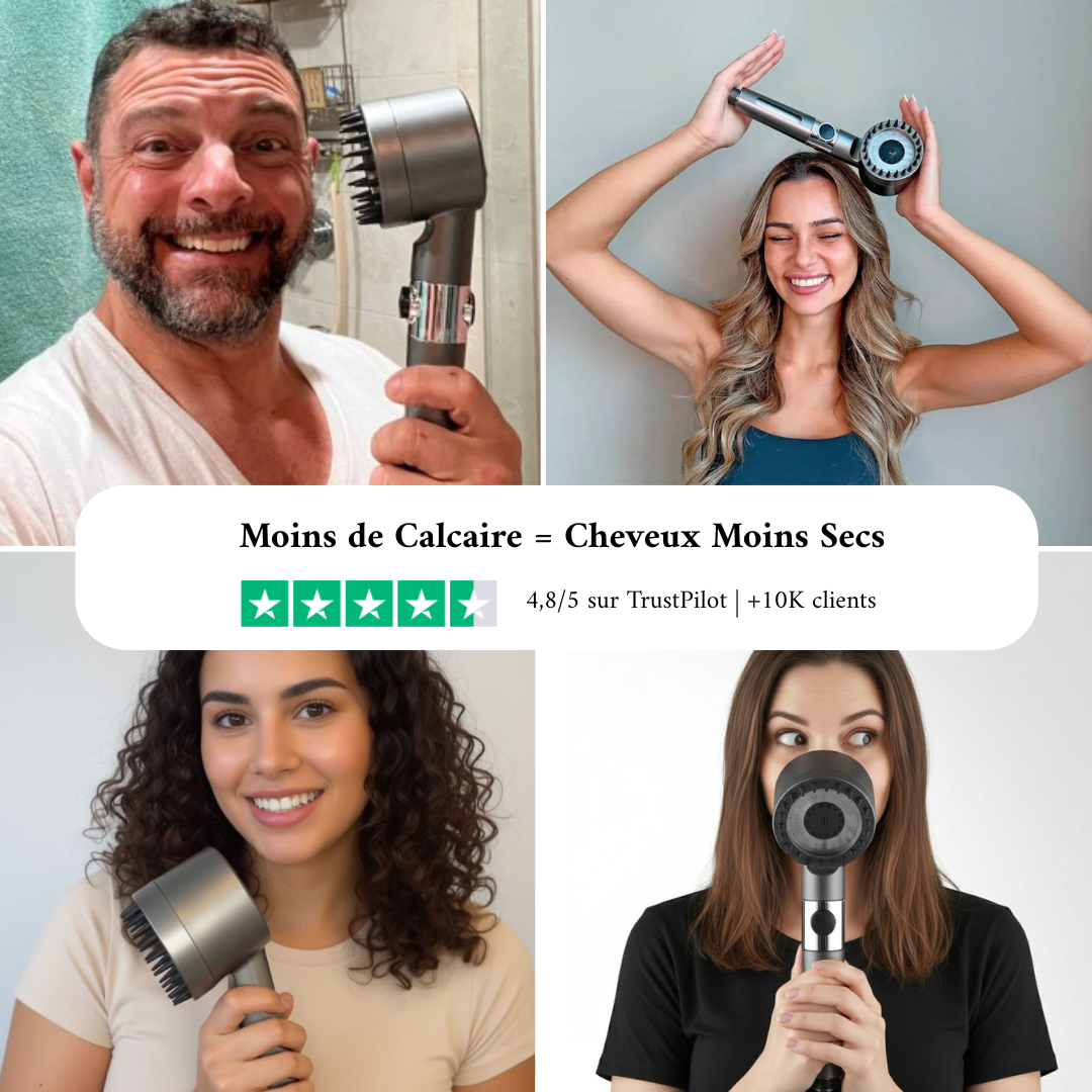 Saviez-vous que 85 % des foyers en France ont de l'eau dure ? Cette eau est chargée d'impuretés comme le chlore, la rouille , le calcaire et les métaux lourds, qui endommagent votre peau et vos cheveux.