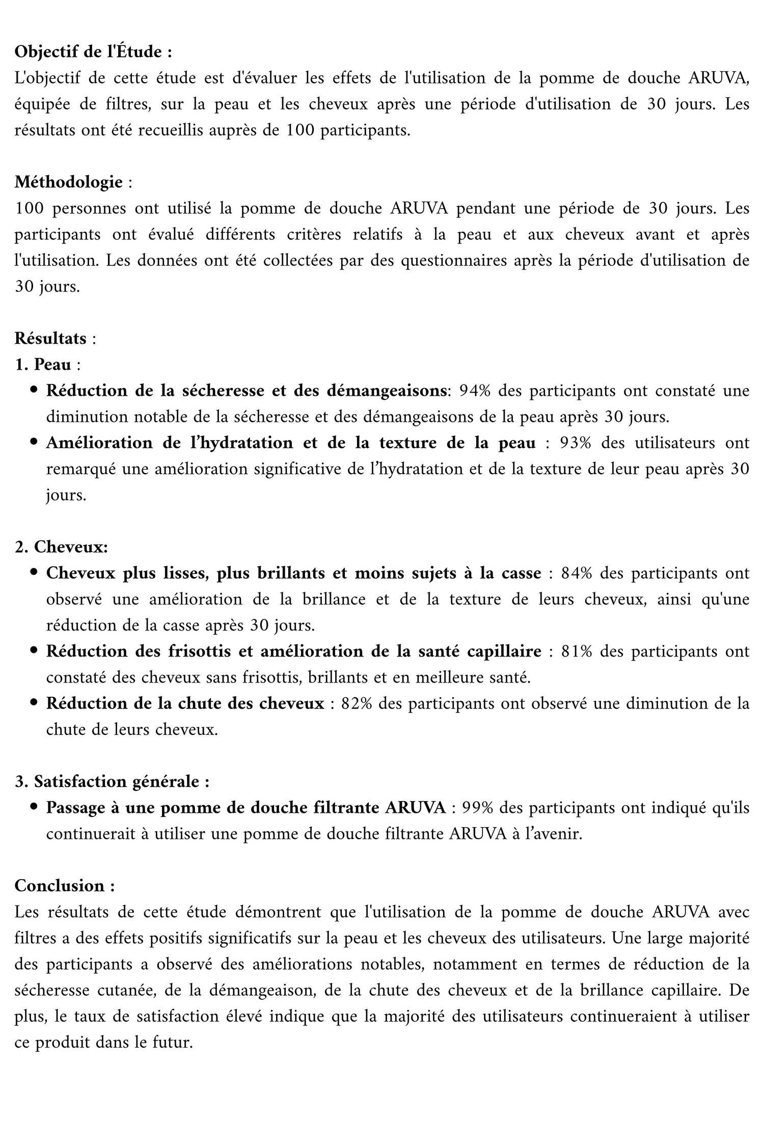 *Étude menée en mars 2025 auprès de 300 participants âgés de 20 à 60 ans, après 30 jours d’utilisation du pommeau filtrant Aruva.
